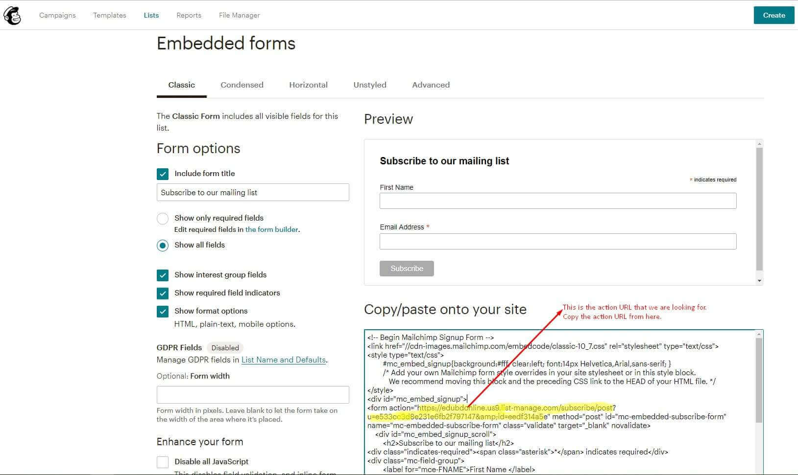 5. Then the Embedded Form code will appear. Look for the action keyword in the form code. This is the Action URL that you are looking for. Copy the action URL from there. Take a look at the screenshot below.