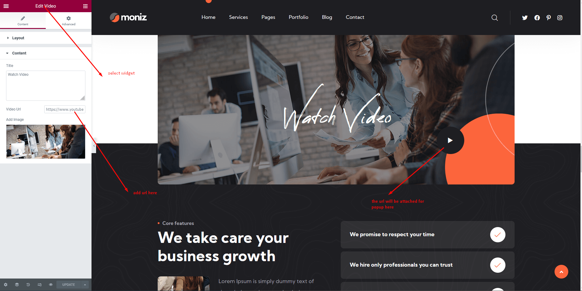Basically we gave support of youtube video embeed on popup. For adding a video in popup you just have to copy the video url and paste it to our desier elementor widget see screenshot below.